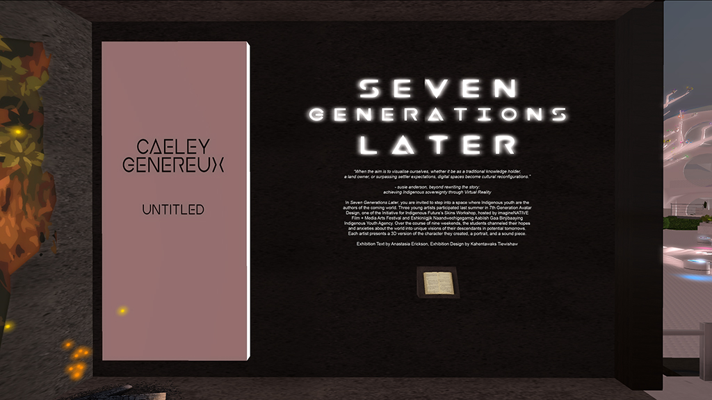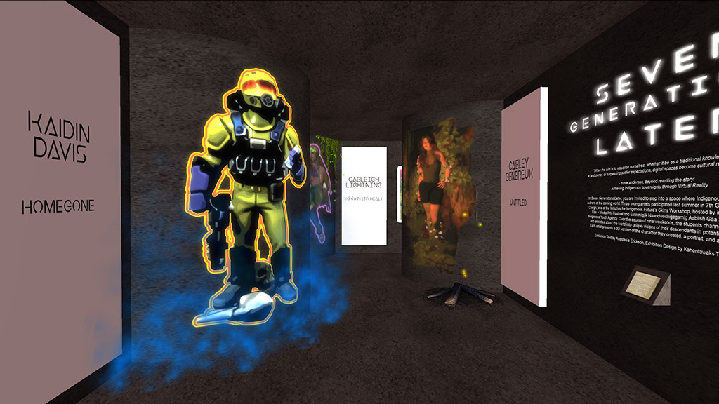 In Seven Generations Later, you are invited to step into a space where Indigenous youth are the authors of the coming world. Three young artists participated last summer in 7th Generation Avatar Design, one of the Initiative for Indigenous Future’s Skins Workshop, hosted by imagineNATIVE Film + Media Arts Festival and Eshkiniigjik Naandwechigegamig Aabiish Gaa Binjibaaying Indigenous Youth Agency. Over the course of nine weekends, the students channeled their hopes and anxieties about the world into unique visions of their descendants in potential tomorrows. Each artist presents a 3D version of the character they created, a portrait, and a sound piece.